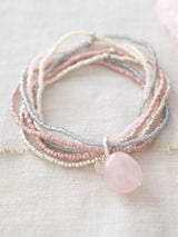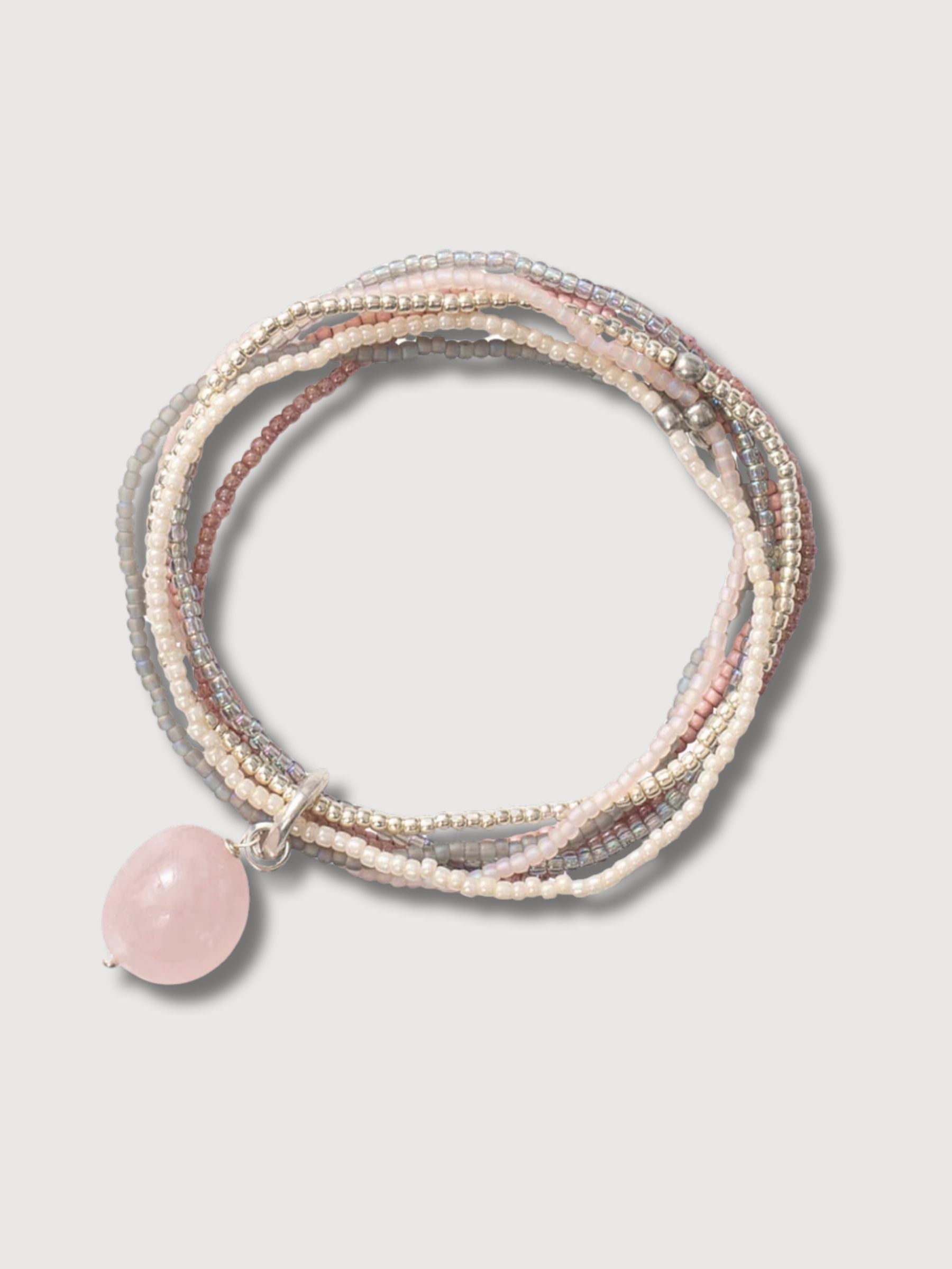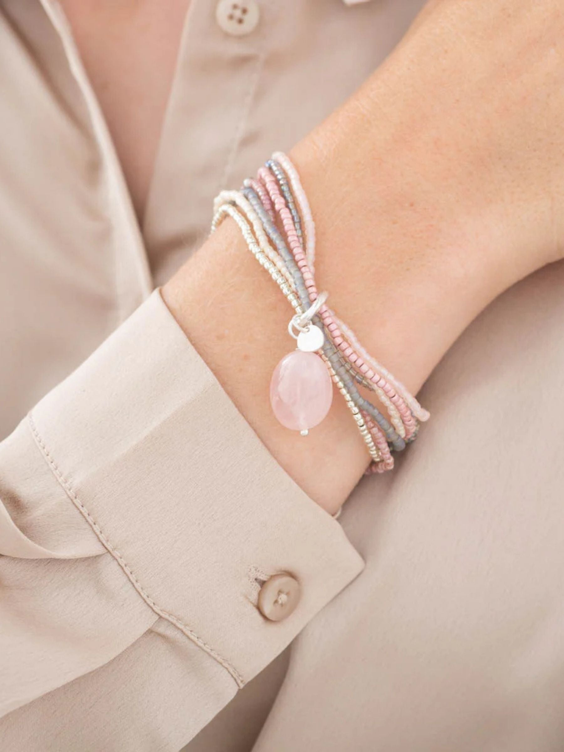 Das silberfarbene Armband Nirmala Rose Quartz von A Beautiful Story ist ein elegantes Accessoire, das aus sieben Strängen aus farbigen Glasperlen und versilberten Messingperlen besteht, die an einem elastischen Band befestigt sind. Die Stränge sind durch einen handgefertigten, silberfarbenen Ring mit einem großen Rosenquarzstein verbunden. Die Länge des Armbands beträgt 17 cm.