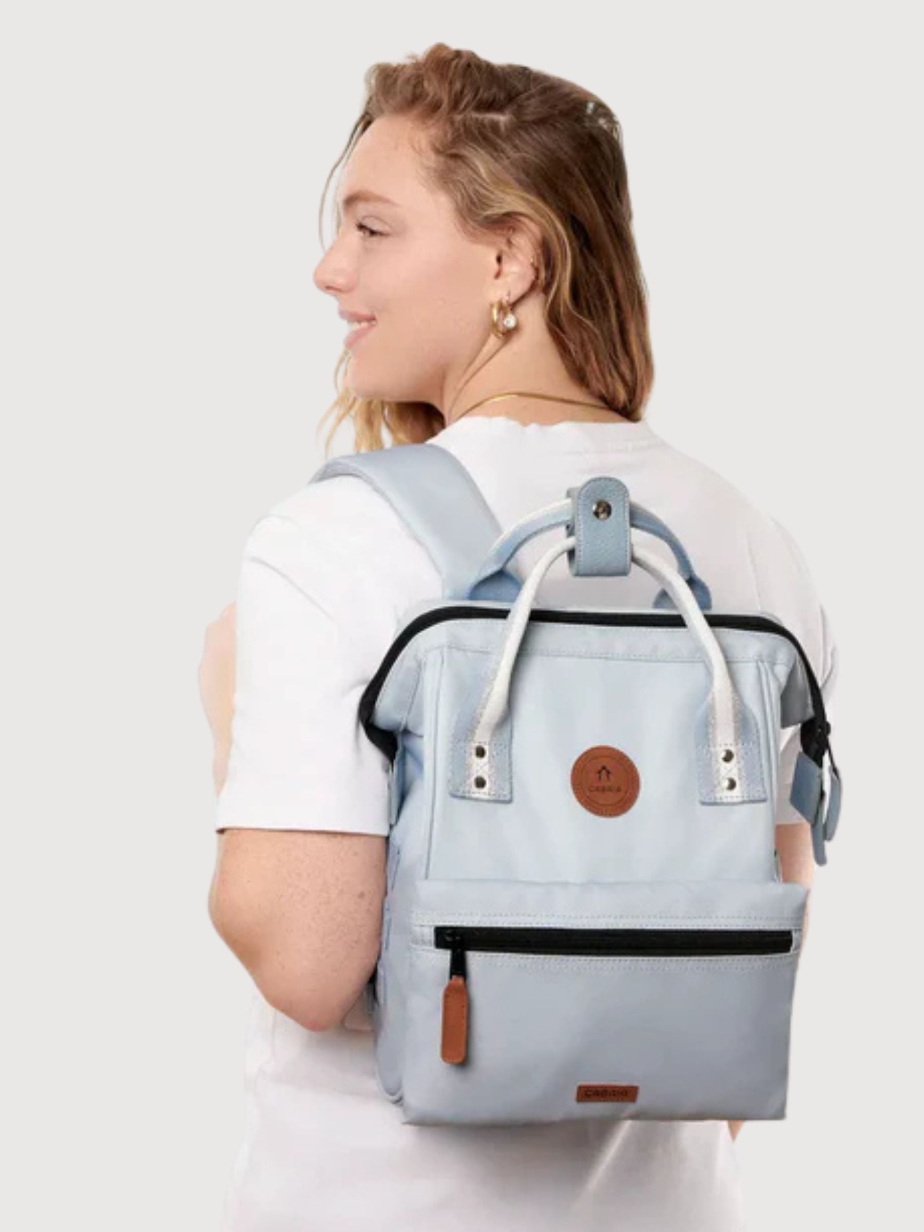 Crafted from recycled Oxford fabric, this light blue backpack is fully vegan, water-repellent, and designed for everyday life and travel.