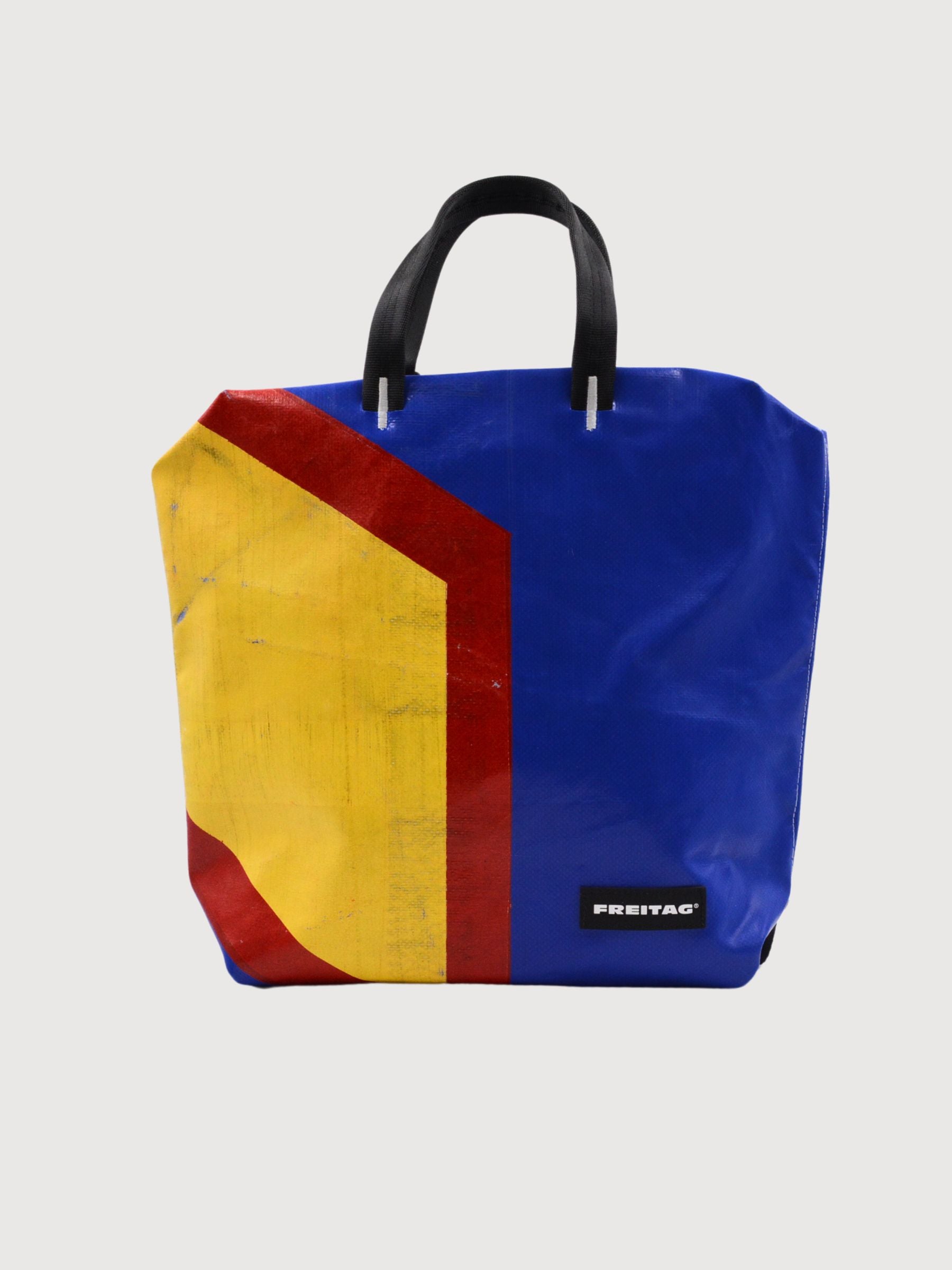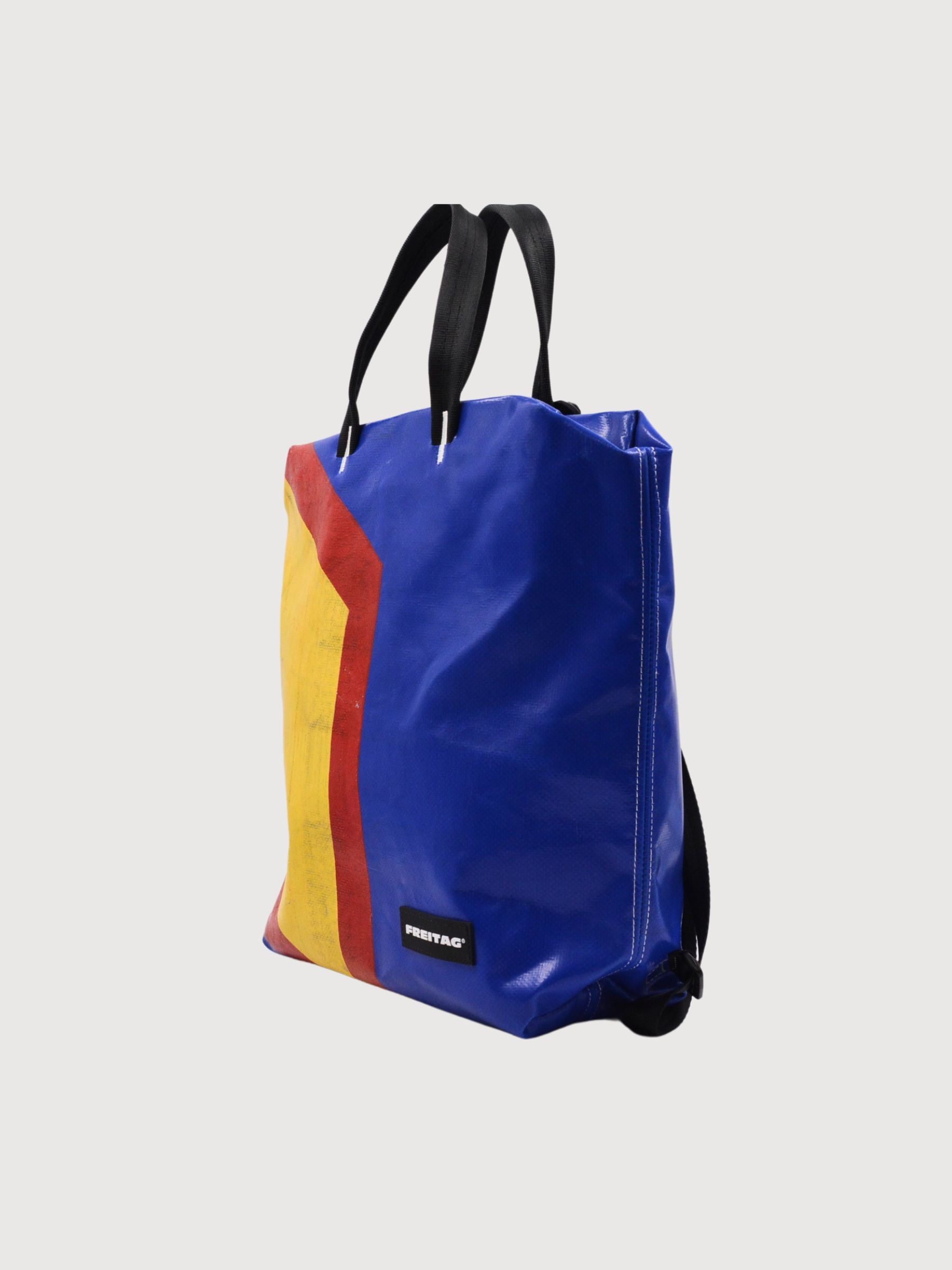 The F201 PETE Freitag Backpack Multicolor, blue, red and yellow, is a compact and versatile city backpack, designed for those who value sustainability, functionality, and durability. Made from 100% upcycled truck tarps, each backpack is unique, carrying a story from the road to your everyday adventures.