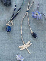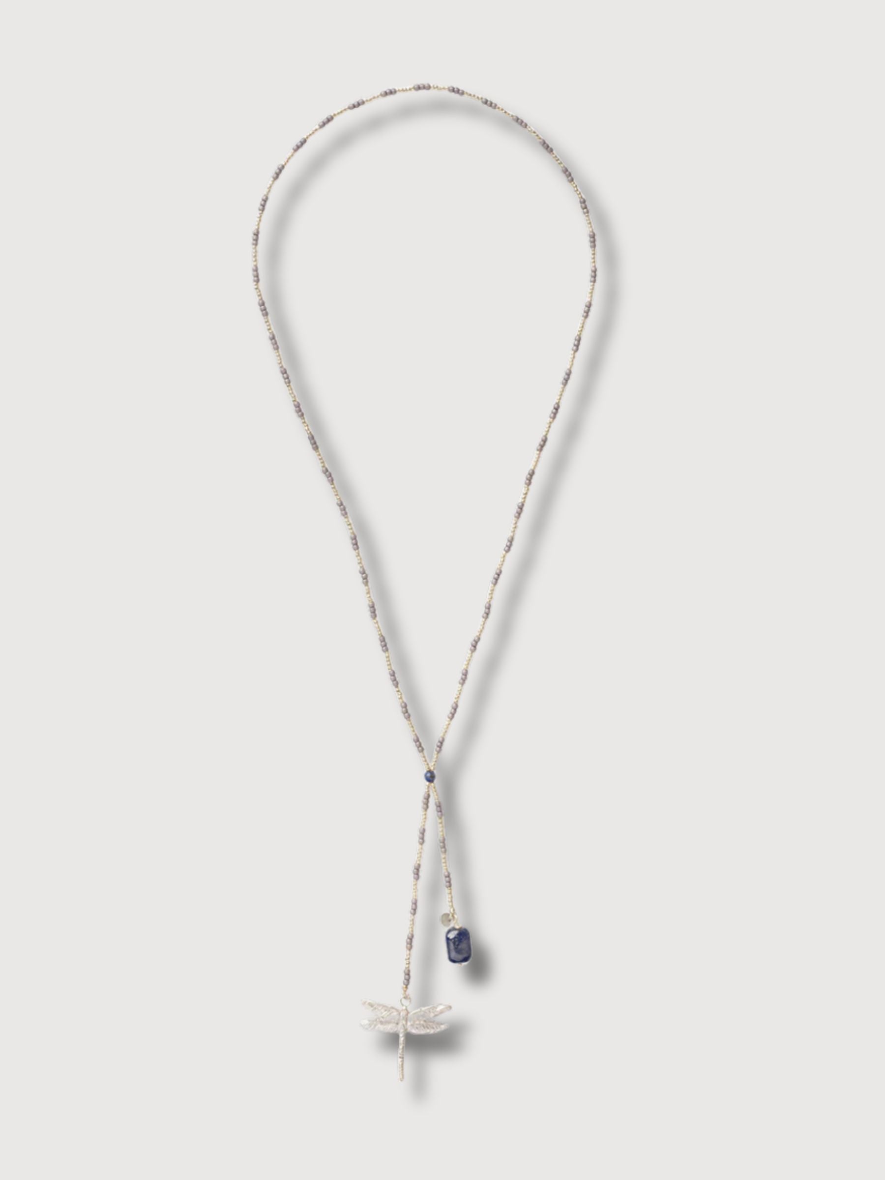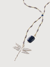 Discover A Beautiful Story's silver-colored lapis lazuli long necklace, an 80-centimeter handcrafted piece of jewelry that combines elegance and profound symbolism. Handcrafted with lilac and silver-colored glass beads, this necklace features a lapis lazuli gemstone and a large silver-plated dragonfly pendant. Lapis lazuli is known for its power to connect us to our hearts, while the dragonfly symbolizes change, adventure and intuition, making this necklace a meaningful accessory.