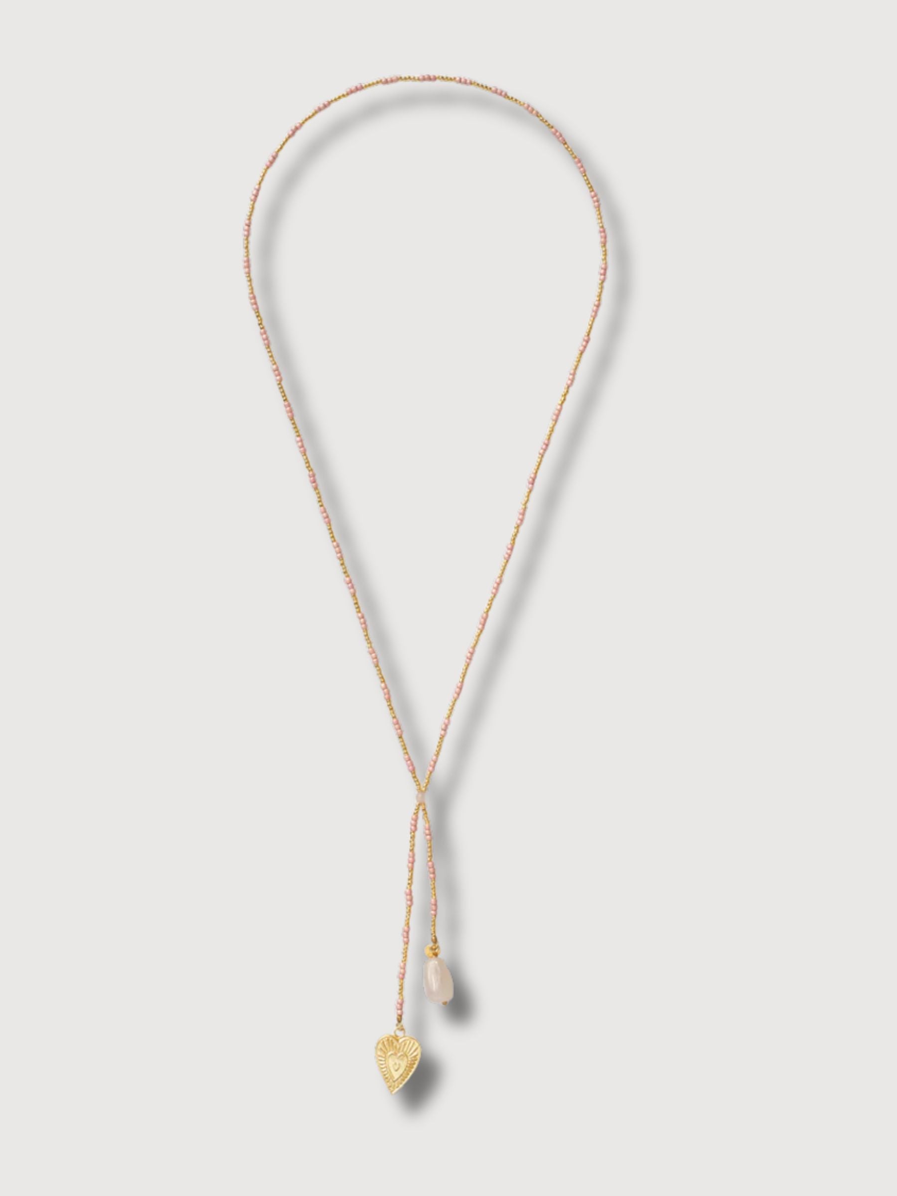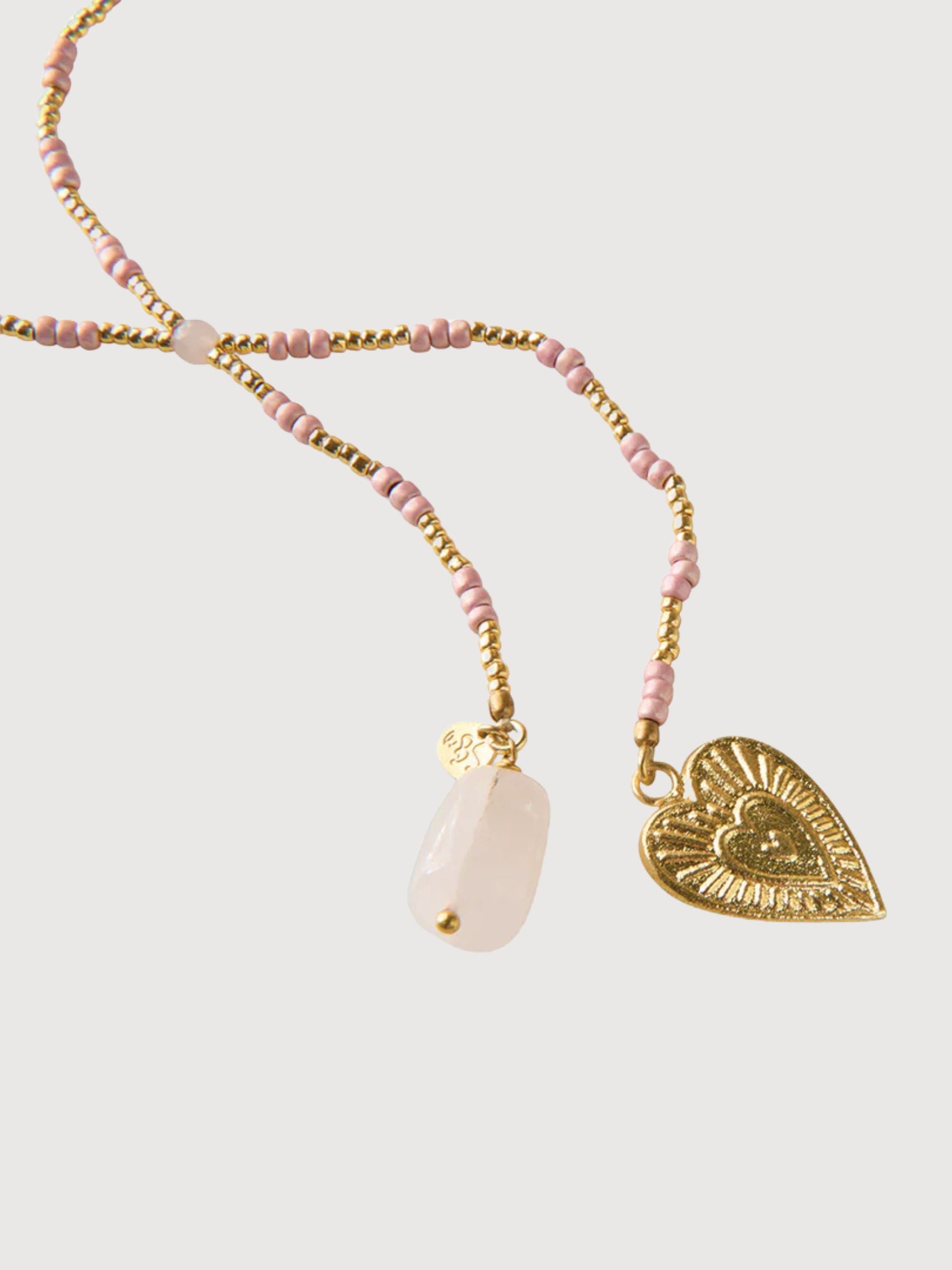 Discover A Beautiful Story's gold-tone rose quartz long necklace, an 80-centimeter handcrafted piece of jewelry that combines elegance and deep meaning. Handcrafted with pink and gold glass beads, this necklace is enhanced by a rose quartz gemstone and a large gold-plated vintage heart pendant. Rose quartz and the heart symbol are known to bring love, harmony, and positivity into your life, making this necklace a perfect accessory for any occasion.