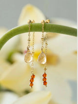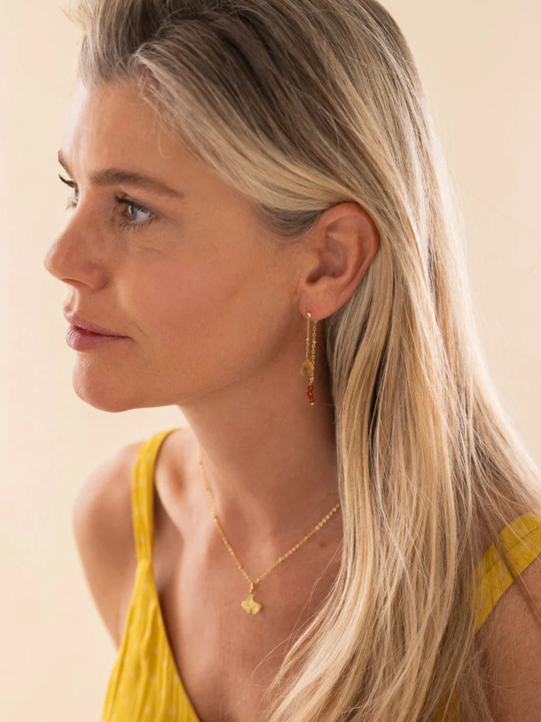 Discover Felicity Earrings Citrine Gold-Plated Carnelian, handmade gold-plated brass earrings that combine elegance with a playful touch. Measuring 5 centimeters in length, these earrings feature a faceted carnelian drop pendant and small faceted citrine gems. The citrine fills every moment with happiness and joy, while the carnelian sets everything you desire in motion.