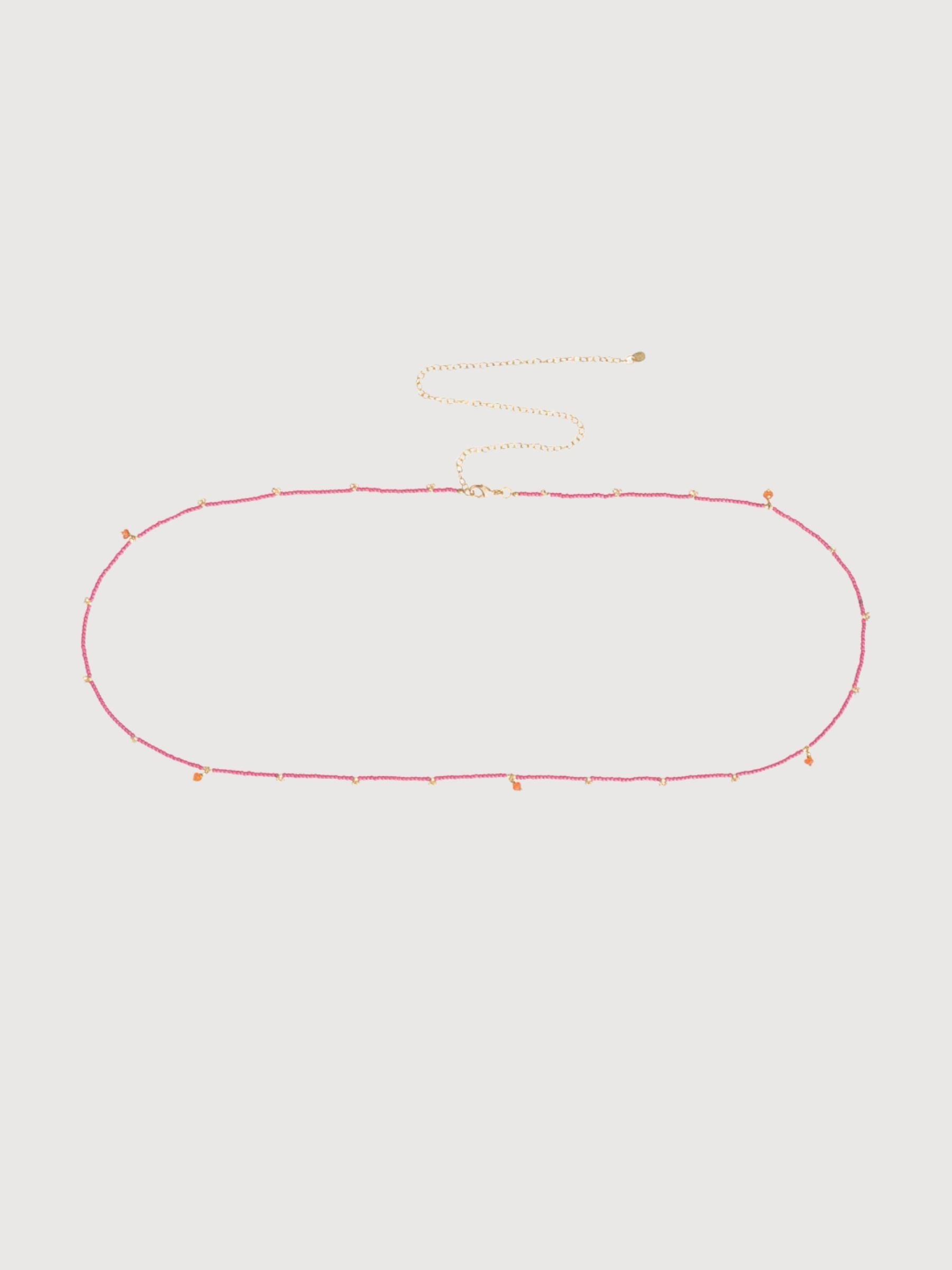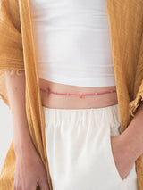 The Festival Carnelian Gold Colored Body Chain from A Beautiful Story is made with glass beads and small carnelian stones, with a gold-plated clasp. This body chain has an adjustable length between 75 and 100 centimeters, perfect for adding an elegant and meaningful touch to your look.