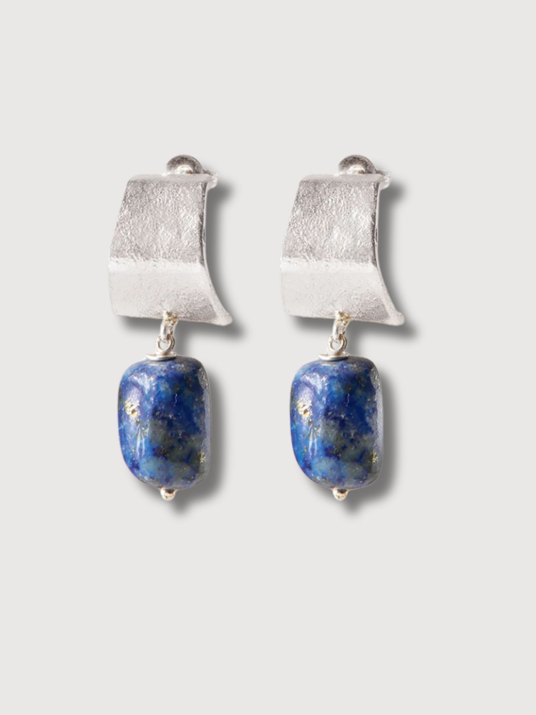 Discover the Honest Lapis Lazuli Silver-Plated Earrings, a real statement piece. Handcrafted from silver-plated brass, these earrings feature an organic shape on top with a matte texture that gives them an elegant and modern look. At 3.5 cm long, they are the perfect complement to any look. The large lapis lazuli gem adds a deep meaning to the design.