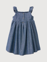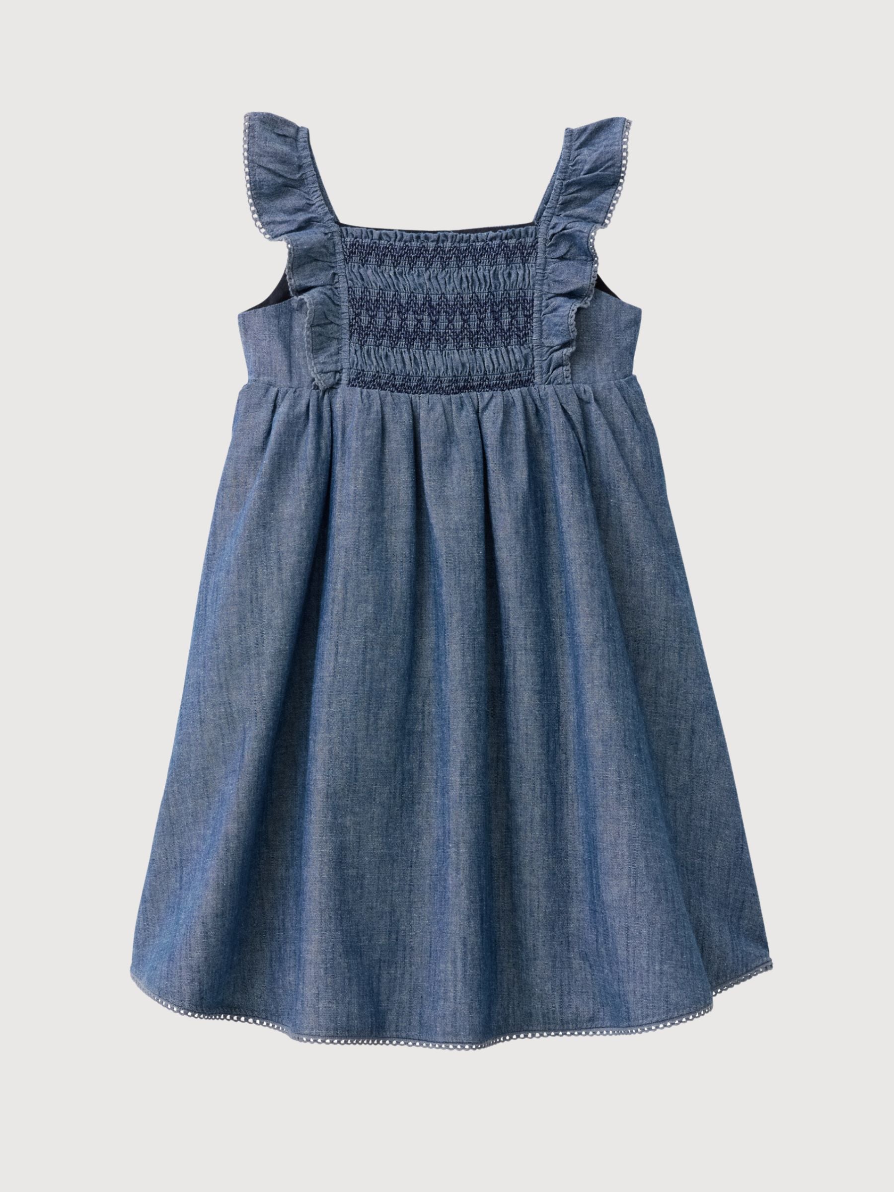 This chambray dress, which resembles denim but is light and airy, is perfect for warm days. With a smocked top and short bell sleeves, it offers a romantic and feminine look. The skirt has a floating width, creating a fluid and comfortable movement.