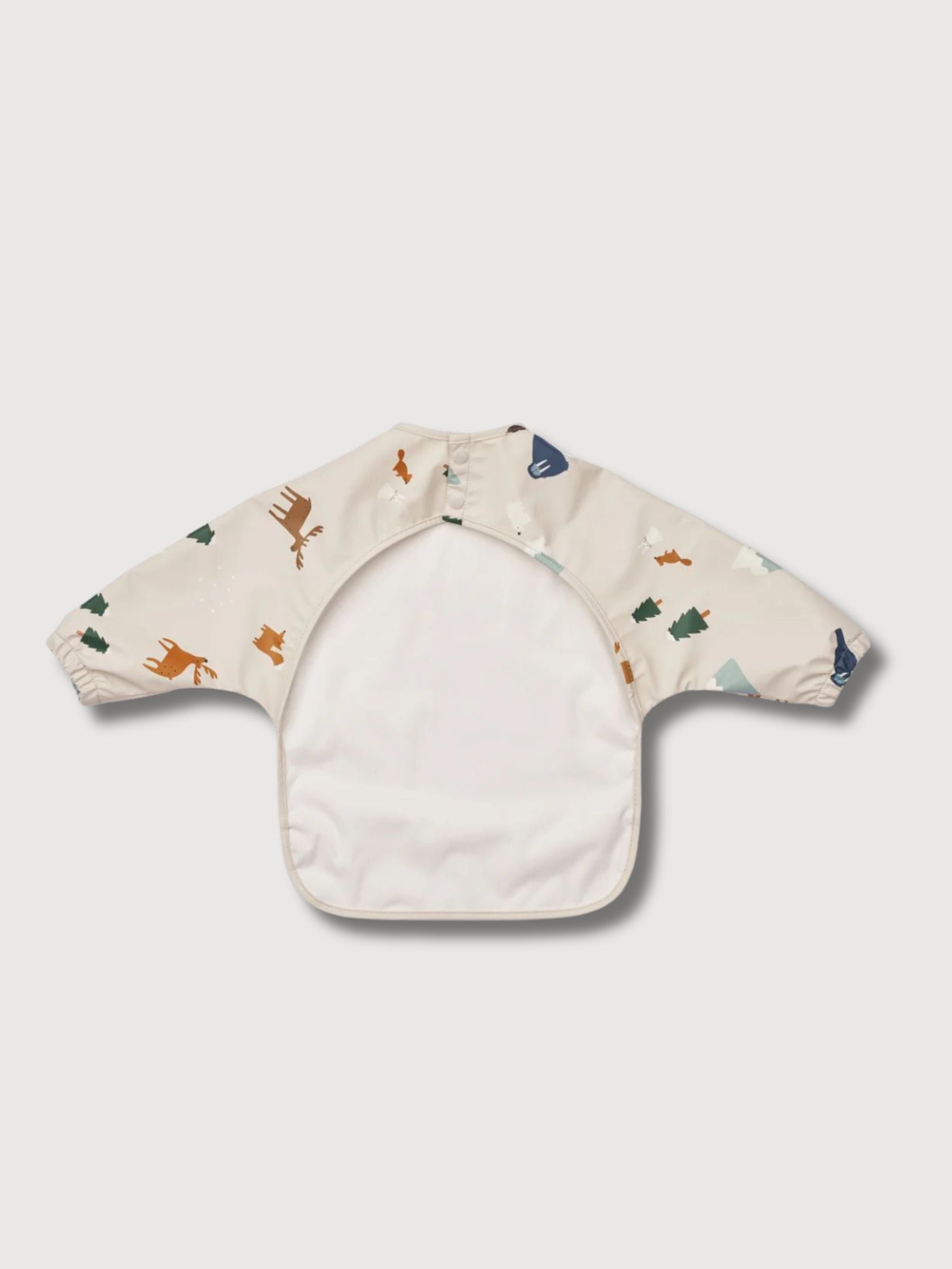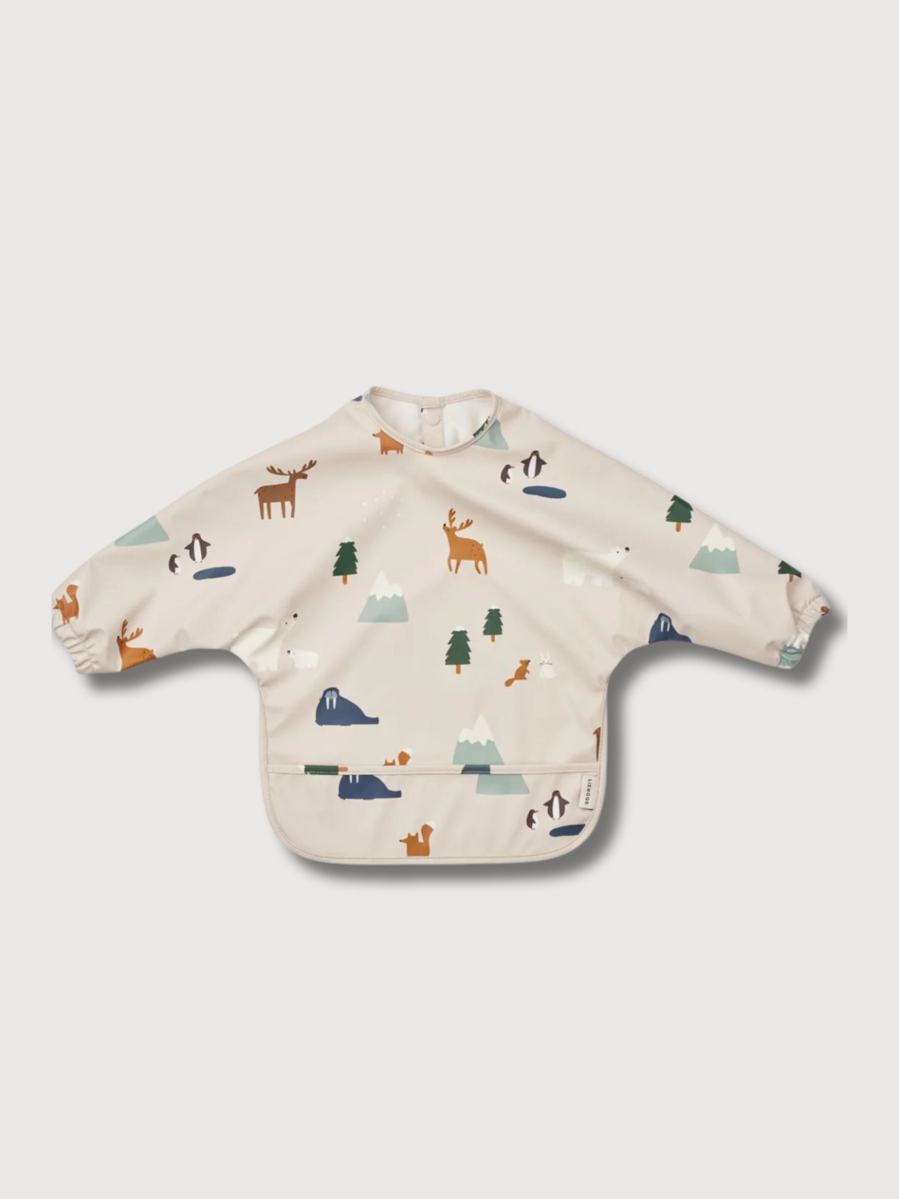 The cape bib with long sleeves is perfect for mealtime, made from OEKO-TEX and GRS-certified recycled polyester. It features elastic cuffs, a catch-all pocket, and a water-repellent coating. Machine-washable and easy to clean, it protects clothes from spills. Dimensions: 43 cm (length), 82 cm (width).