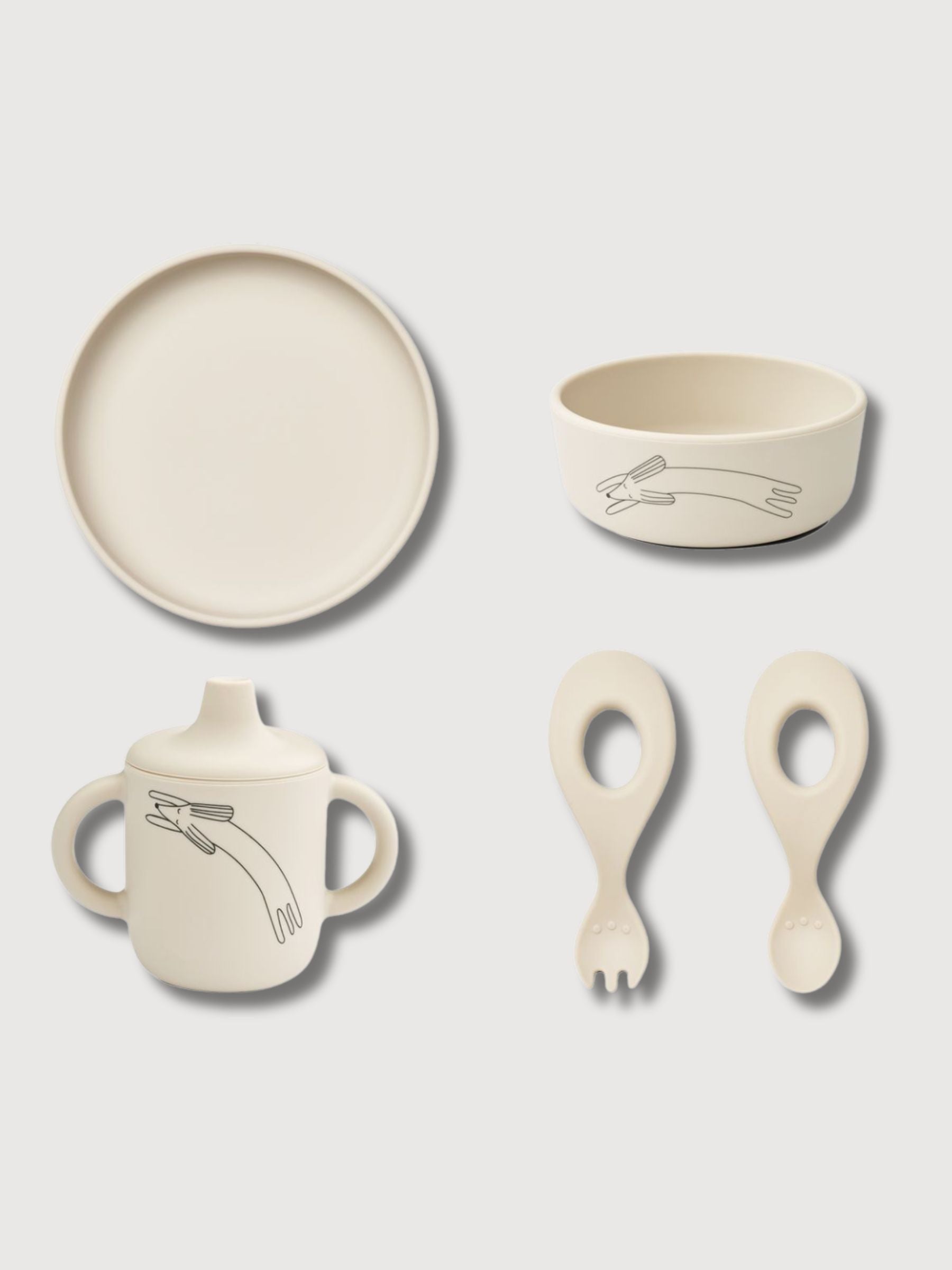 The beige Ryle dinner set by Liewood is made from food-grade, hypoallergenic silicone. It includes a plate and bowl with high edges, a sippy cup with grip-friendly handles, and ergonomic cutlery. BPA and phthalate-free. Set includes: plate, bowl, sippy cup, spoon, and fork.