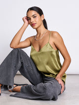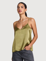 The Green Slip Top is a chic and versatile garment, designed to be worn on many occasions: from a special event to a night out, but also over a turtleneck on cooler days. The design is minimalist and refined, with a deep V-neckline and thin straps, while the straight and wide cut gives a comfortable and fluid fit, without darts on the bust.